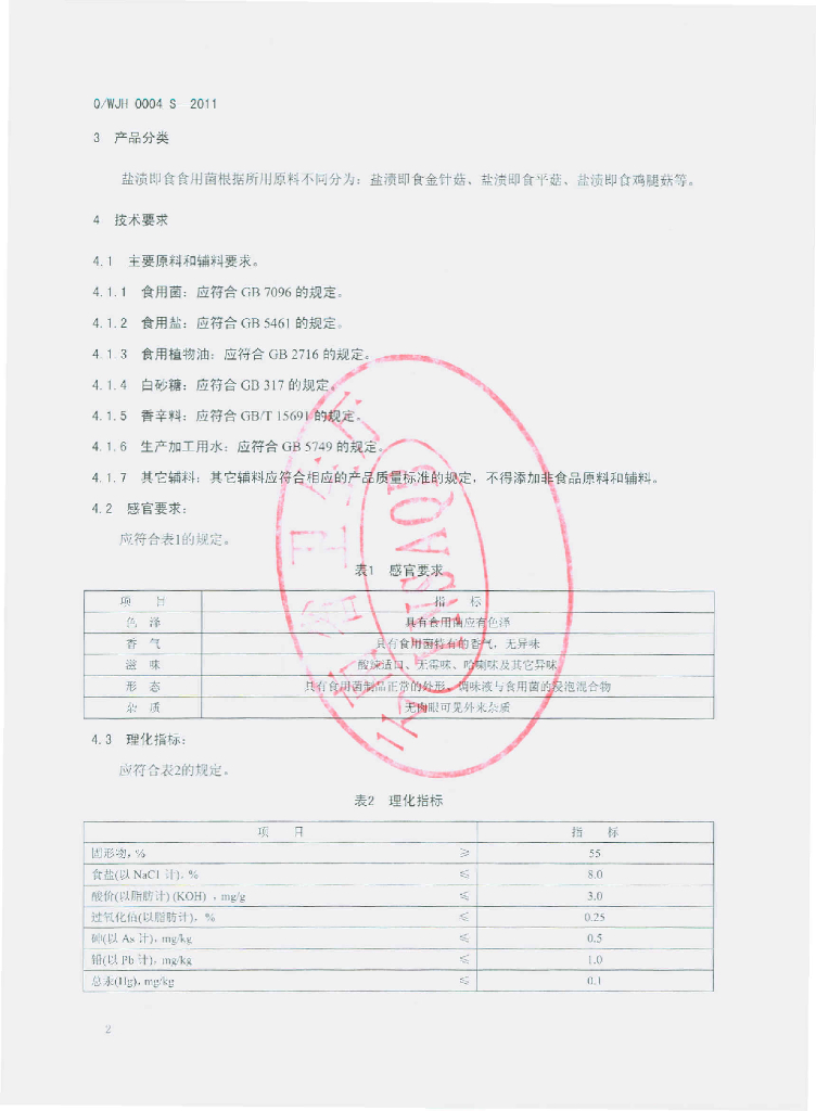 Q/WJH 0004S-2011 盐渍即食食用菌