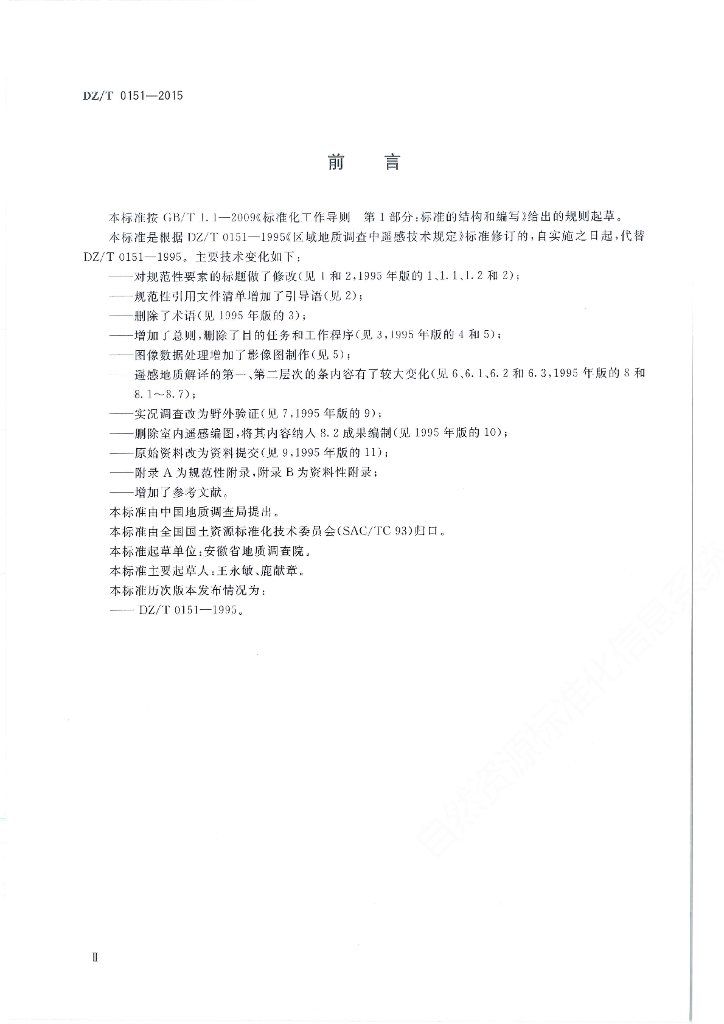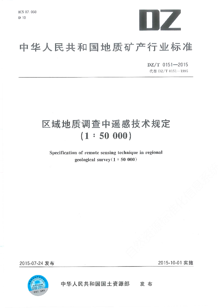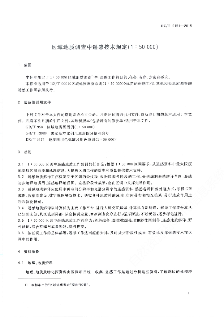 DZ/T 0151-2015 区域地质调查中遥感技术规定(1:50000)