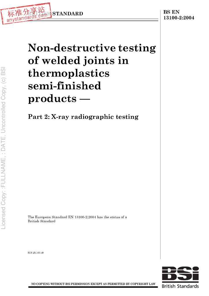 BS EN 13100-2-2004 热塑性半成品焊接接头的无损检验.X射线照相检验