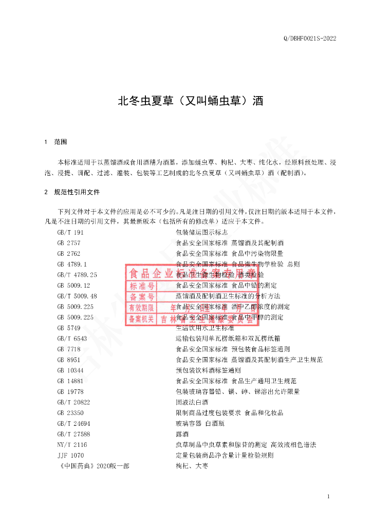 Q/DBHF 0021S-2022 北冬虫夏草酒(配制酒)