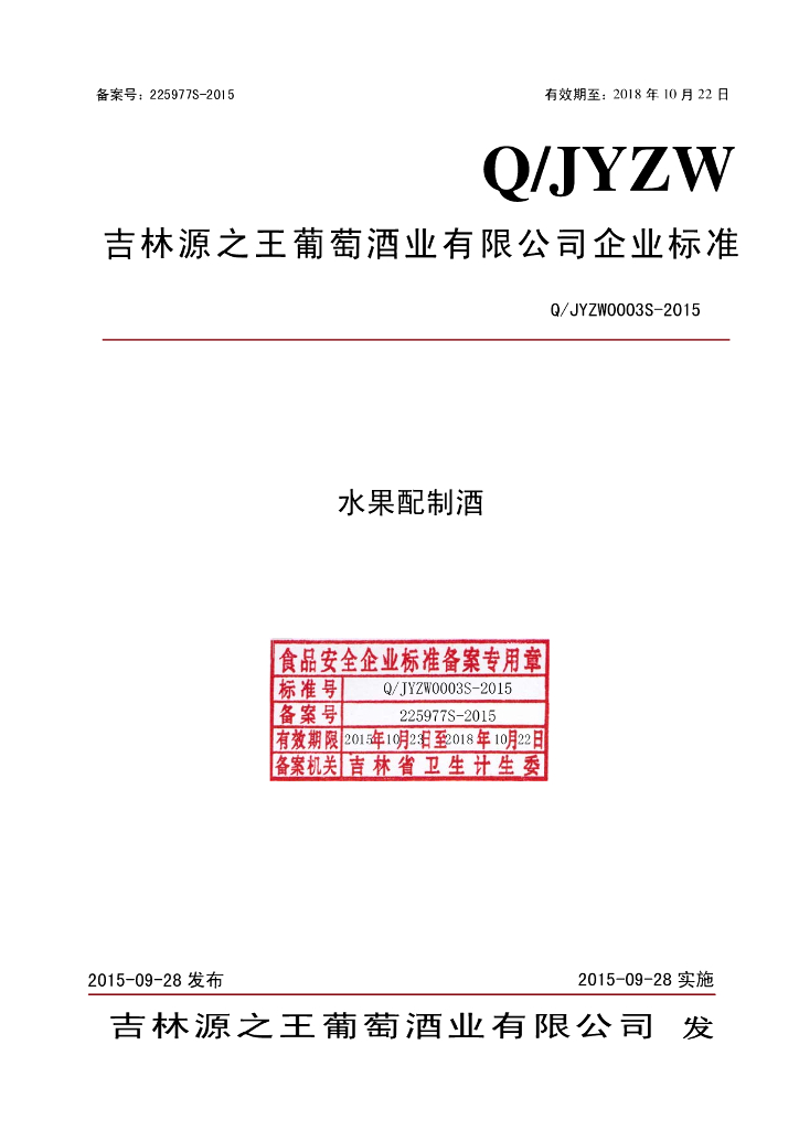 Q/JYZW 0003S-2015 吉林源之王葡萄酒业有限公司 水果配制酒