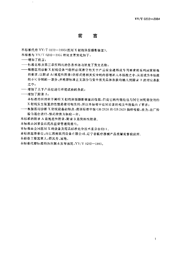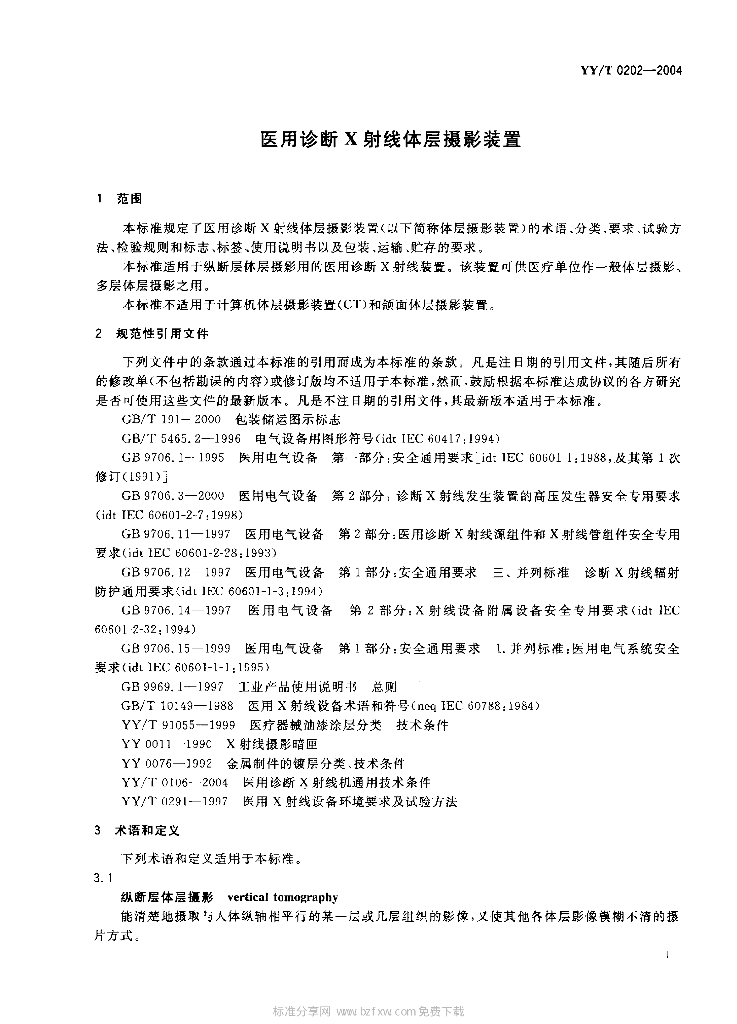 YY/T 0202-2004 医用诊断X射线体层摄影装置