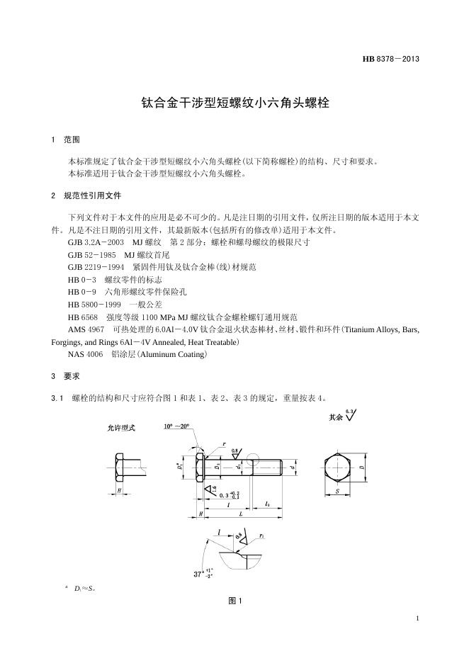 HB 8378-2013(2017) 钛合金干涉型短螺纹小六角头螺栓