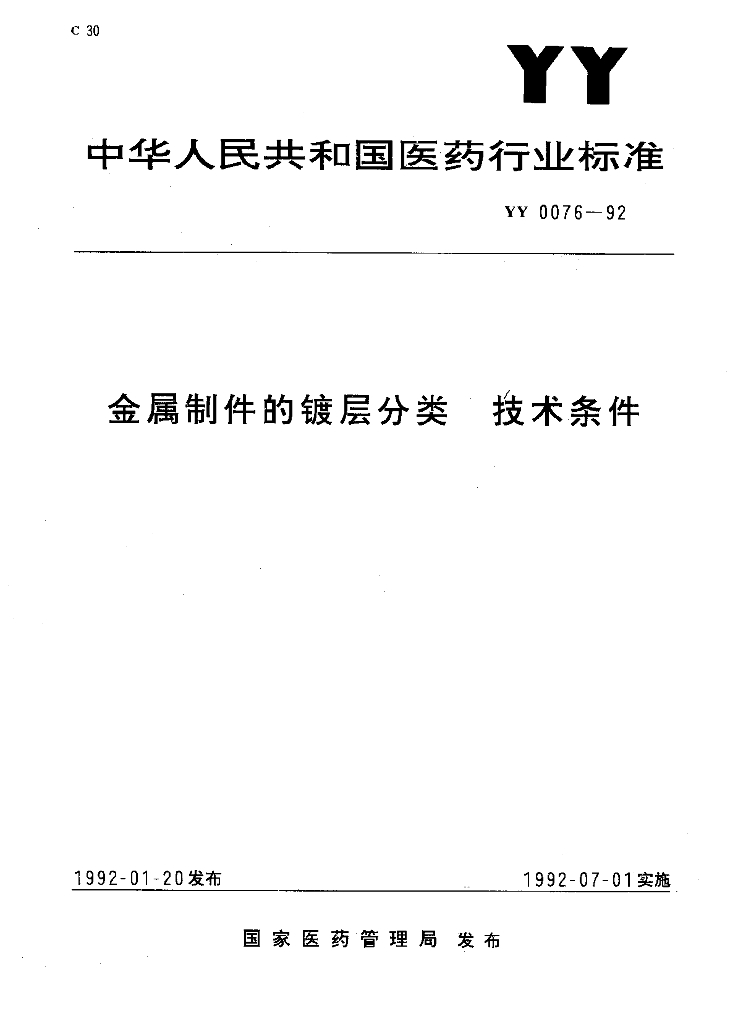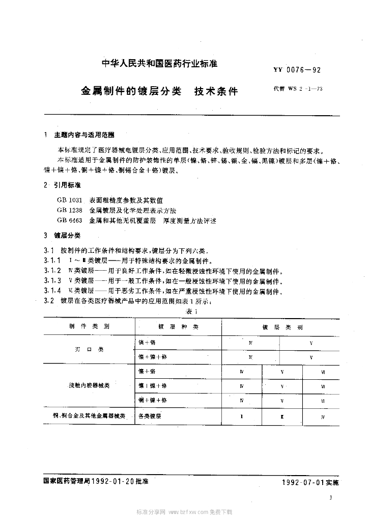 YY 0076-1992 金属制件的镀层分类技术条件