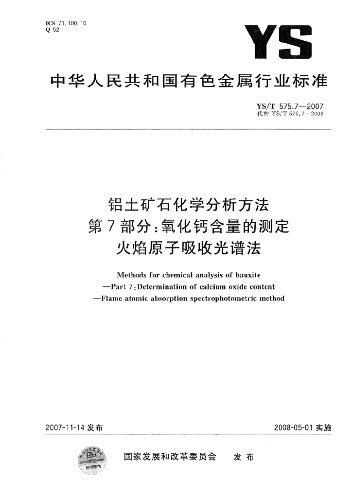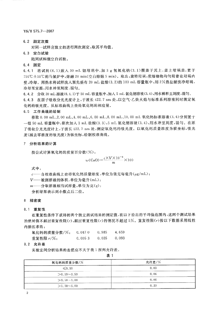 YS/T 575.7-2007 铝土矿石化学分析方法 第7部分:氧化钙含量的测定 火焰原子吸收光谱法