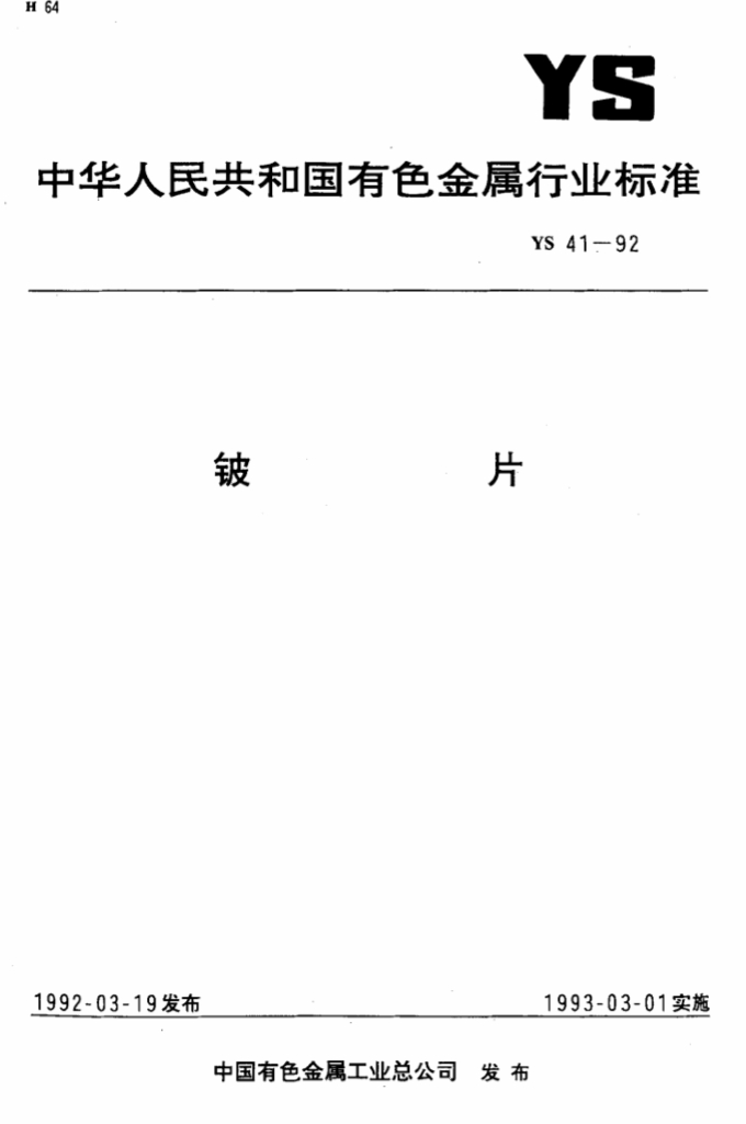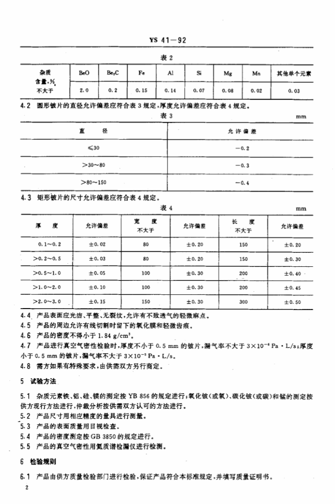 YS 41-1992 铍片标准