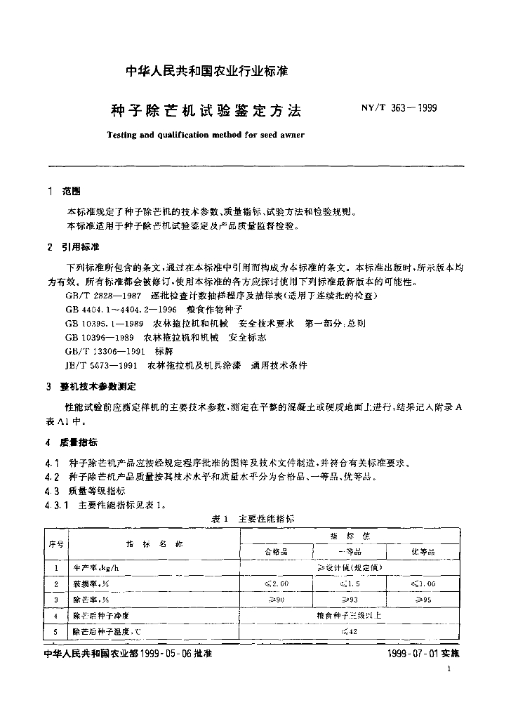 NY/T 363-1999 种子除芒机试验鉴定方法