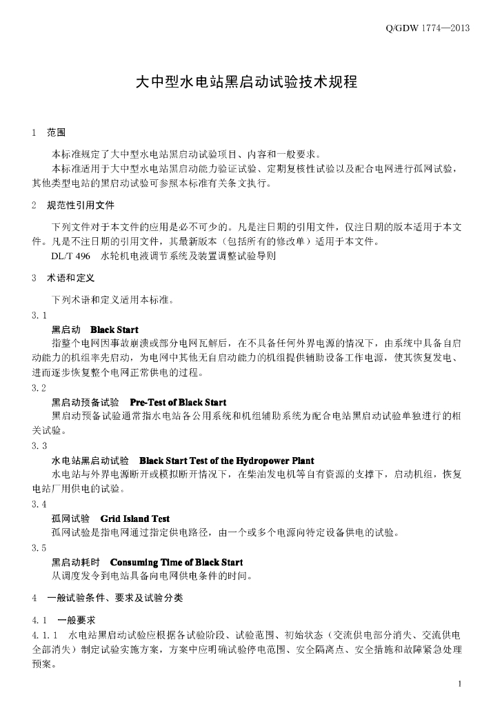 Q/GDW 1774-2013 大中型水电站黑启动试验技术规程