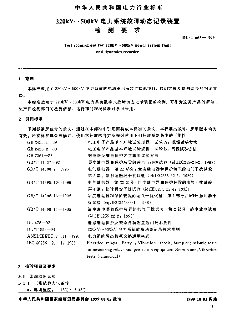 DL/T 663-1999 220kV~500kV电力系统故障动态记录装置检测要求