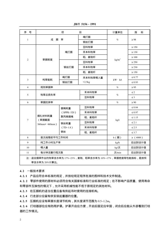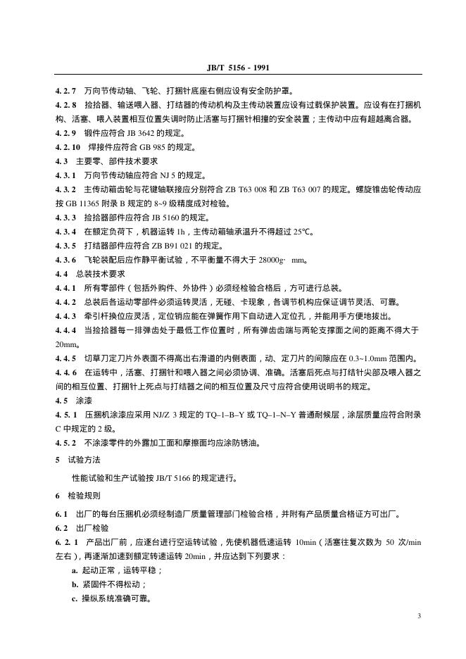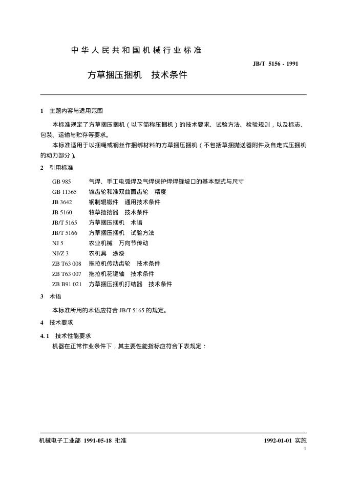JB/T 5156-1991 方草捆压捆机 技术条件