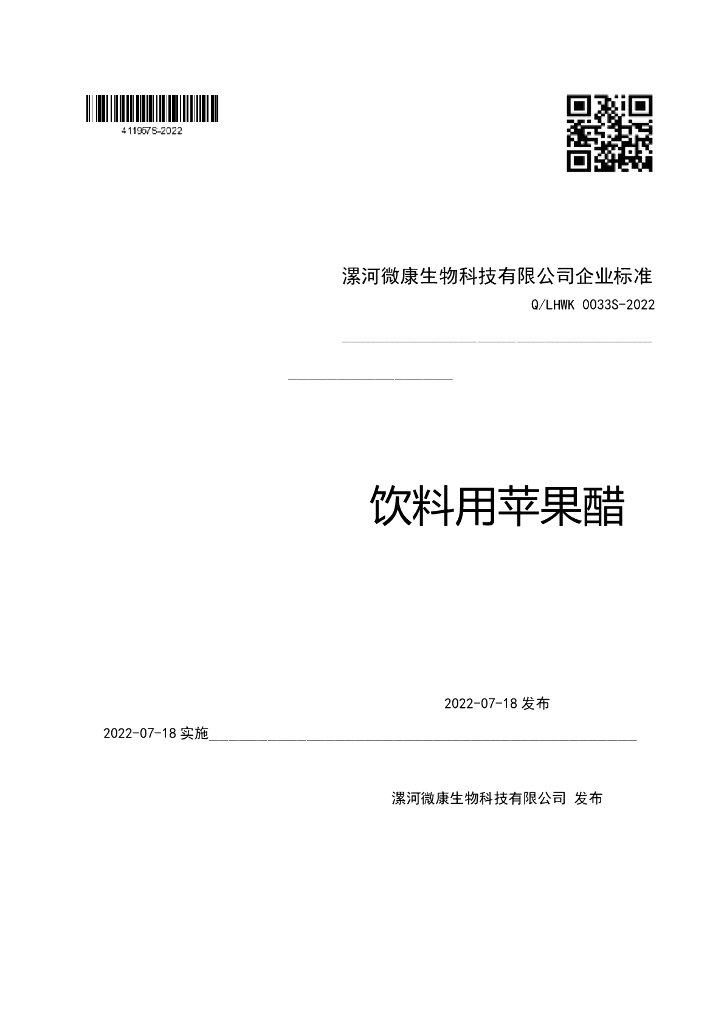 Q/LHWK 0033S-2022 饮料用苹果醋