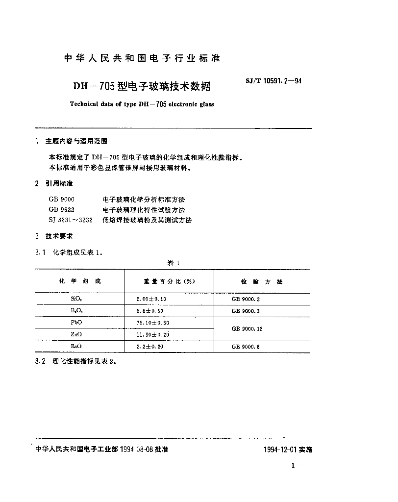SJ/T 10591.2-1994 DH-705型电子玻璃技术数据