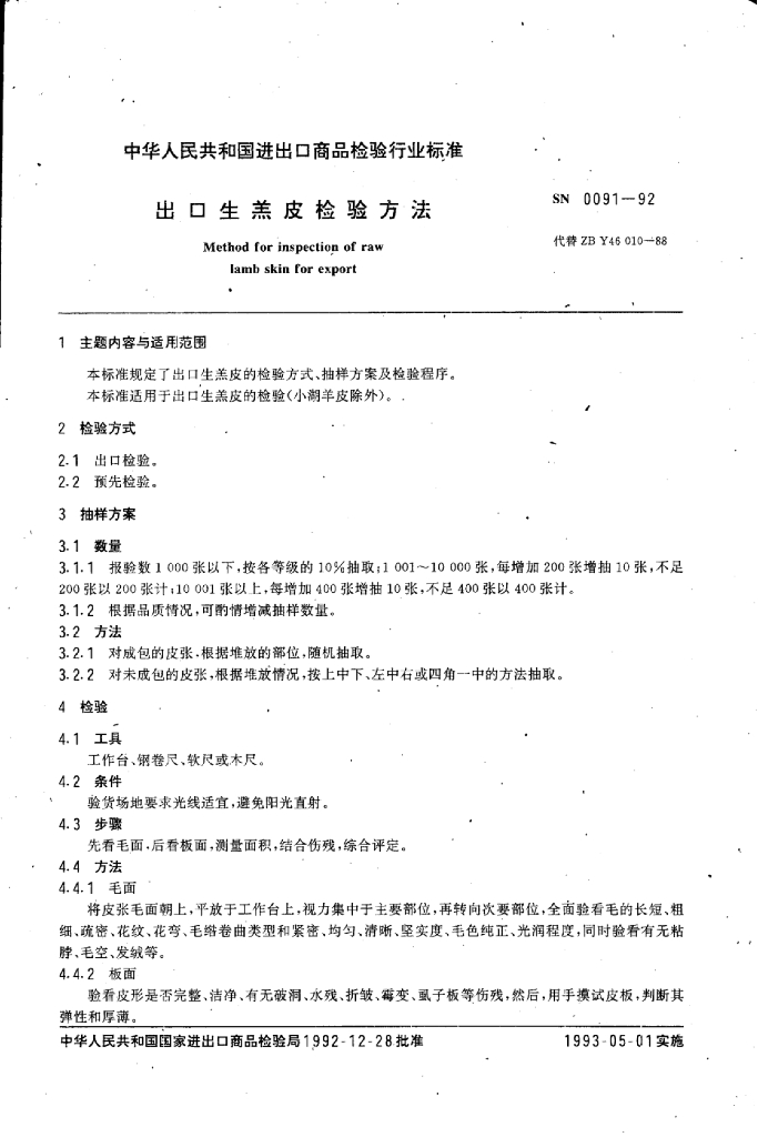 SN 0091-1992 出口生羔皮检验方法