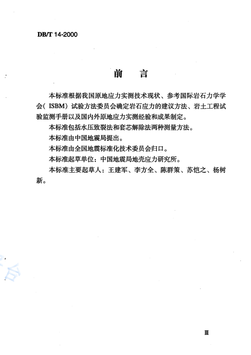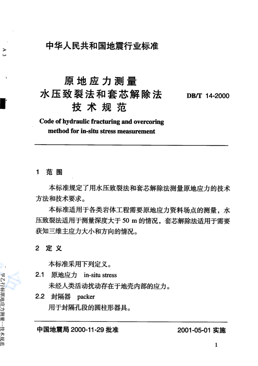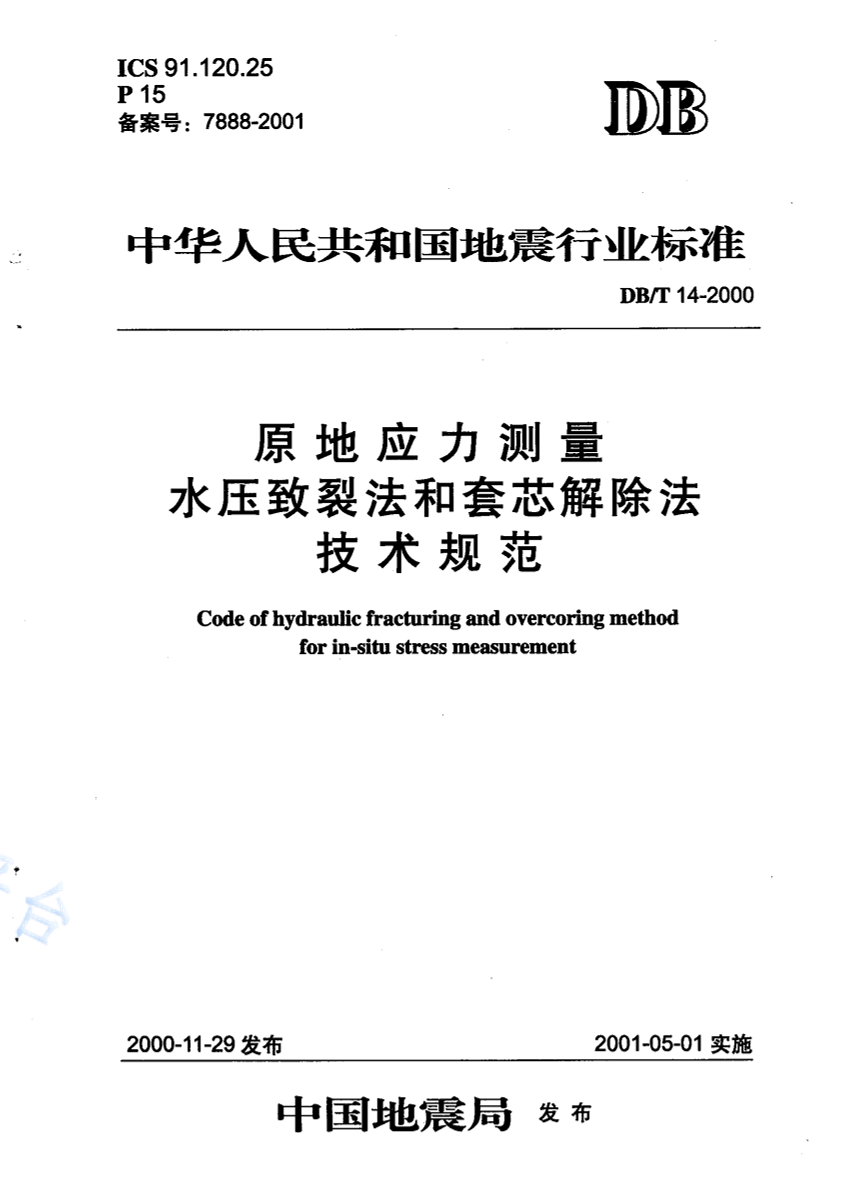 DB/T 14-2000 原地应力测量 水压致裂法和套芯解除法 技术规范