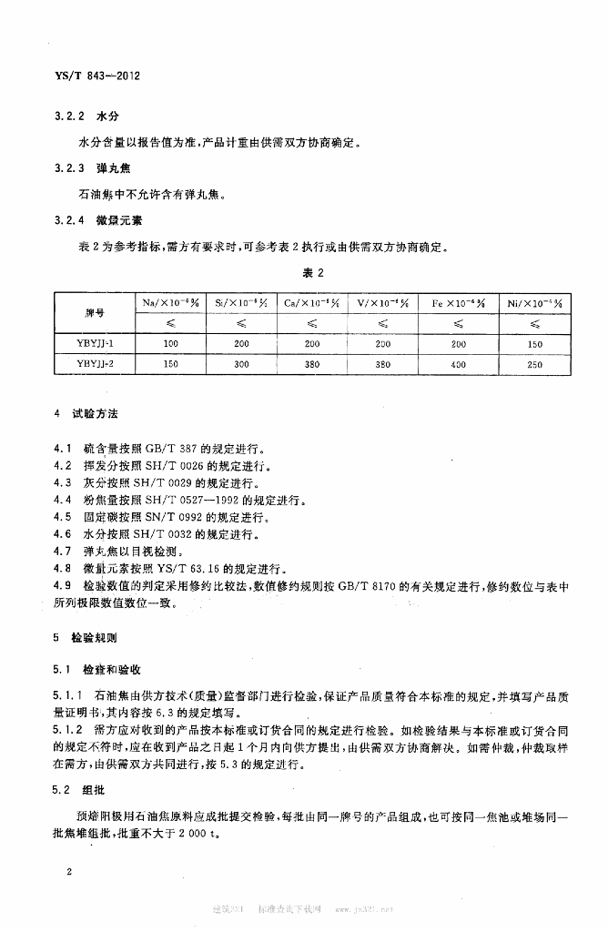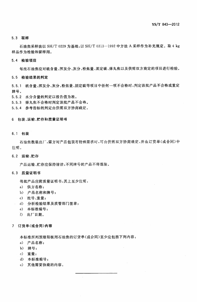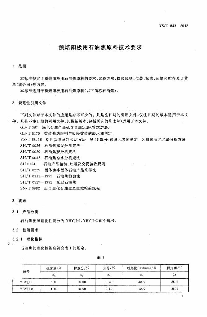 YS/T 843-2012 预焙阳极用石油焦原料技术要求