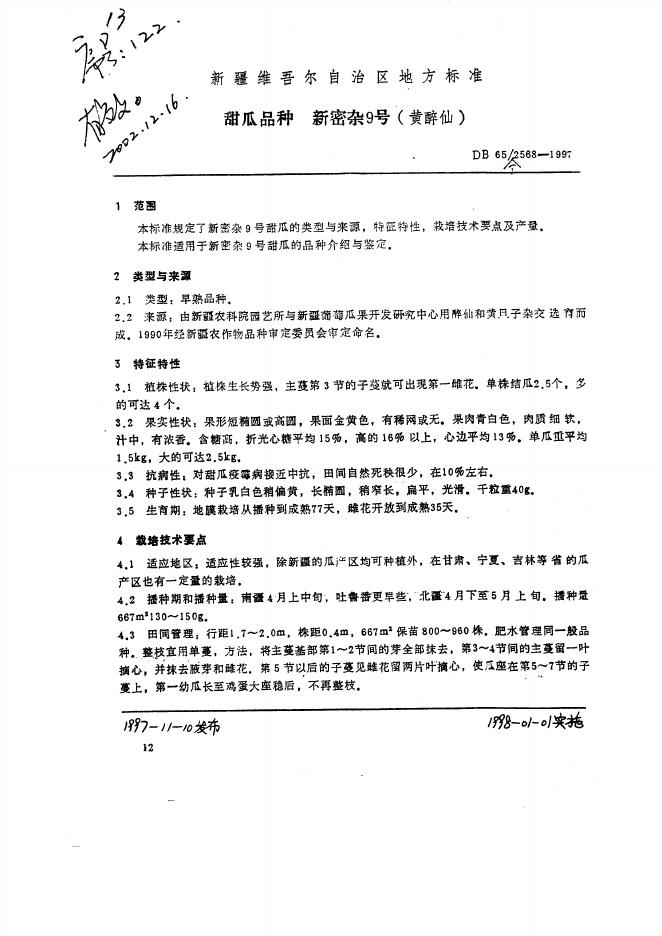 DB65/T 2568-1997 甜瓜品种 新密杂9号