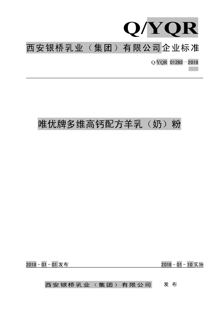 Q/YQR 0128S-2018 唯优牌多维高钙配方羊乳(奶)粉