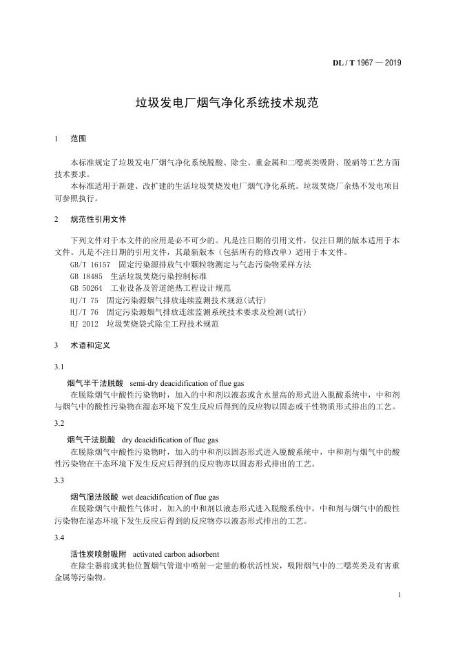 DL/T 1967-2019 垃圾发电厂烟气净化系统技术规范