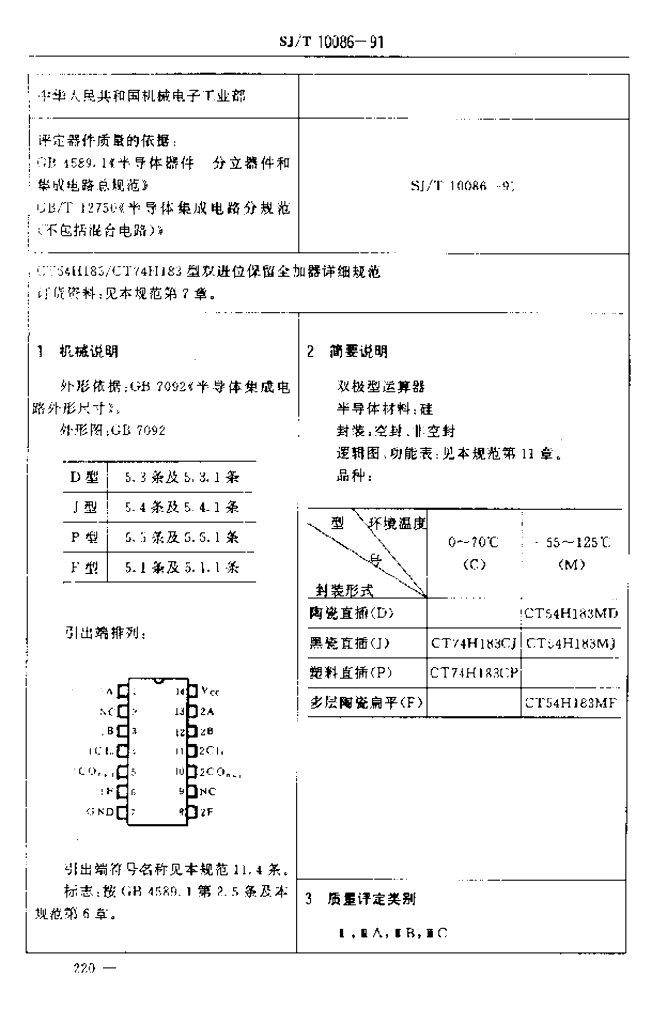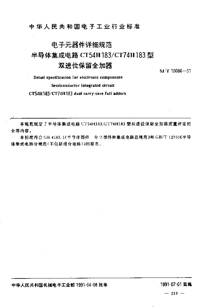 SJ/T 10086-1991 电子元器件详细规范半导体集成电路CT54H183/CT74H183型双进位保留全加器