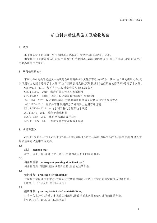 MT/T 1254-2025 矿山斜井后注浆施工及验收规范