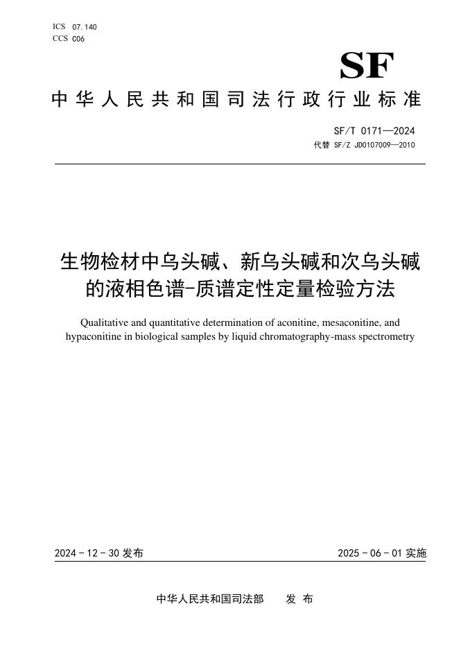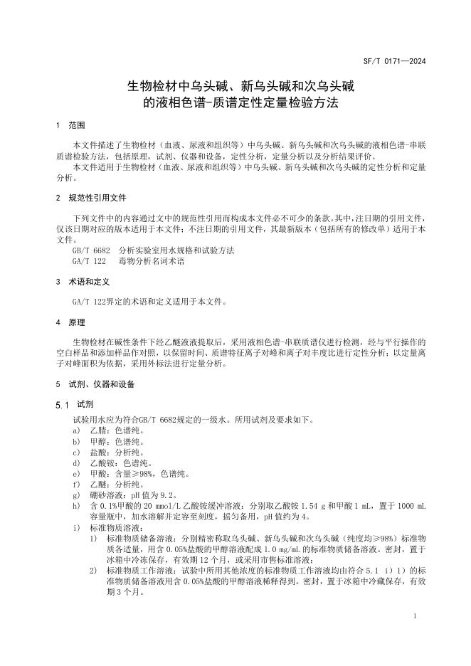 SF/T 0171-2024 生物检材中乌头碱、新乌头碱和次乌头碱的液相色谱-质谱定性定量检验方法