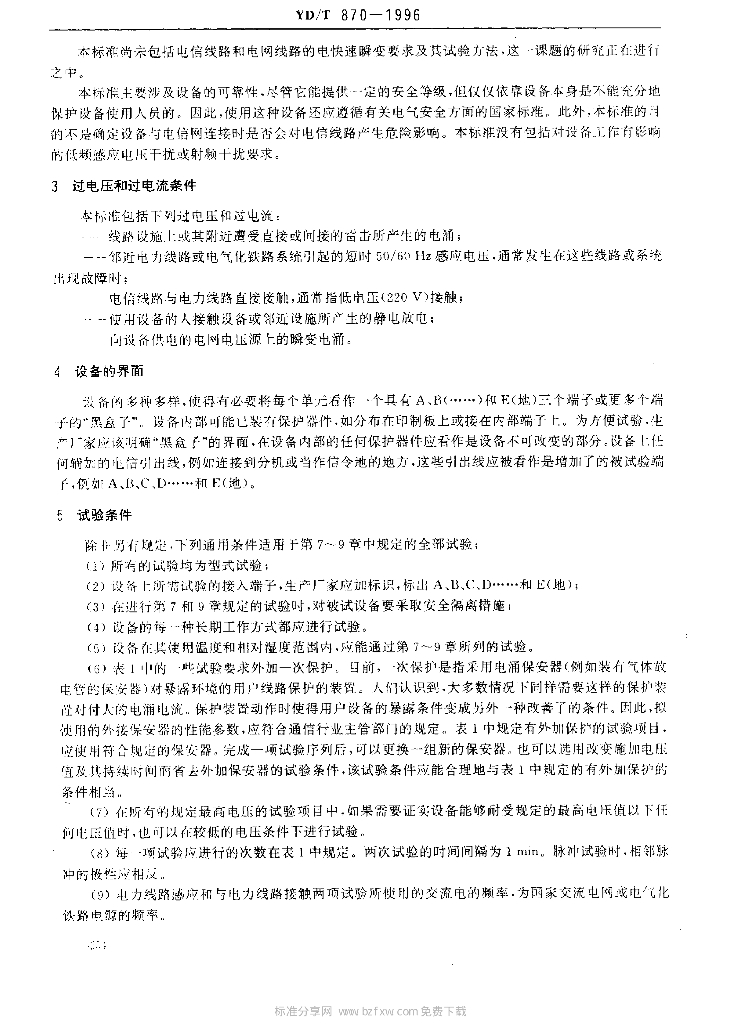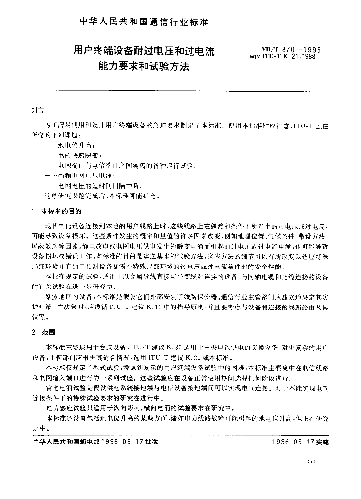 YD/T 870-1996 用户终端设备耐过电压和过电流能力要求和试验方法