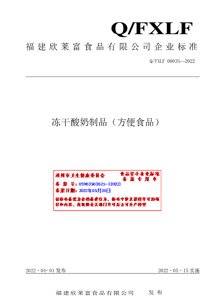 Q/FXLF 0003S-2022 冻干酸奶制品(方便食品)