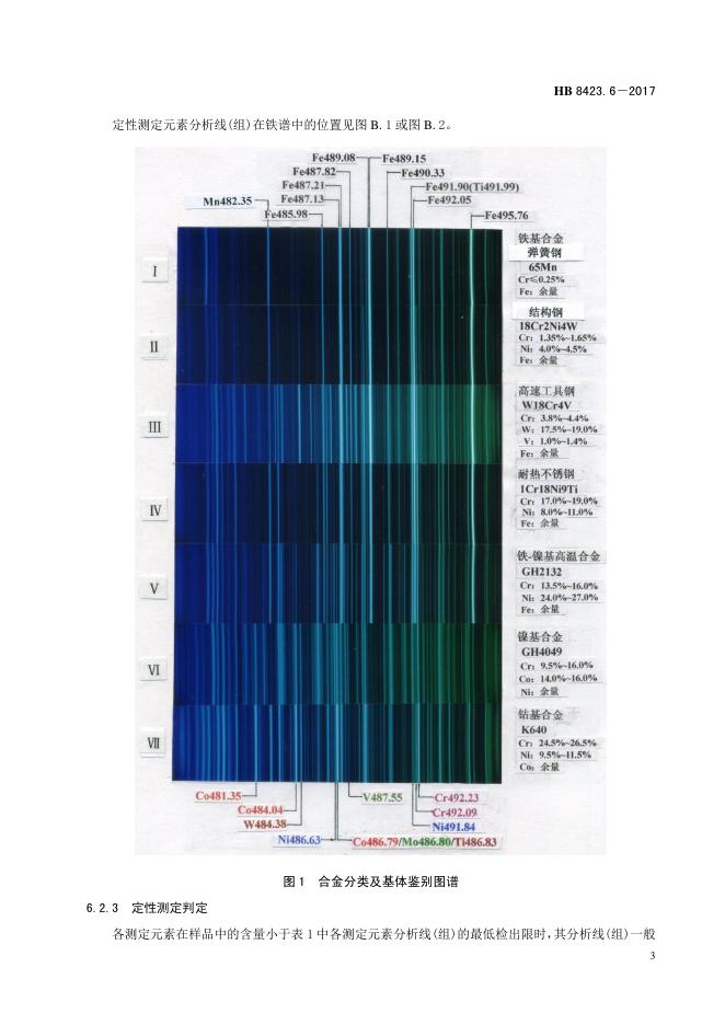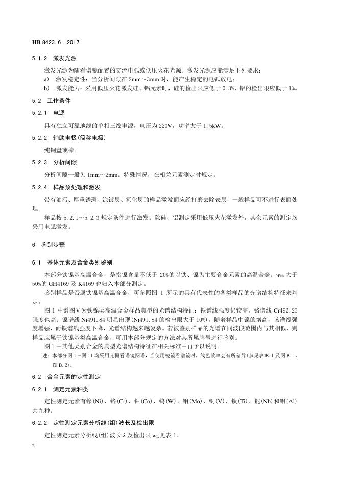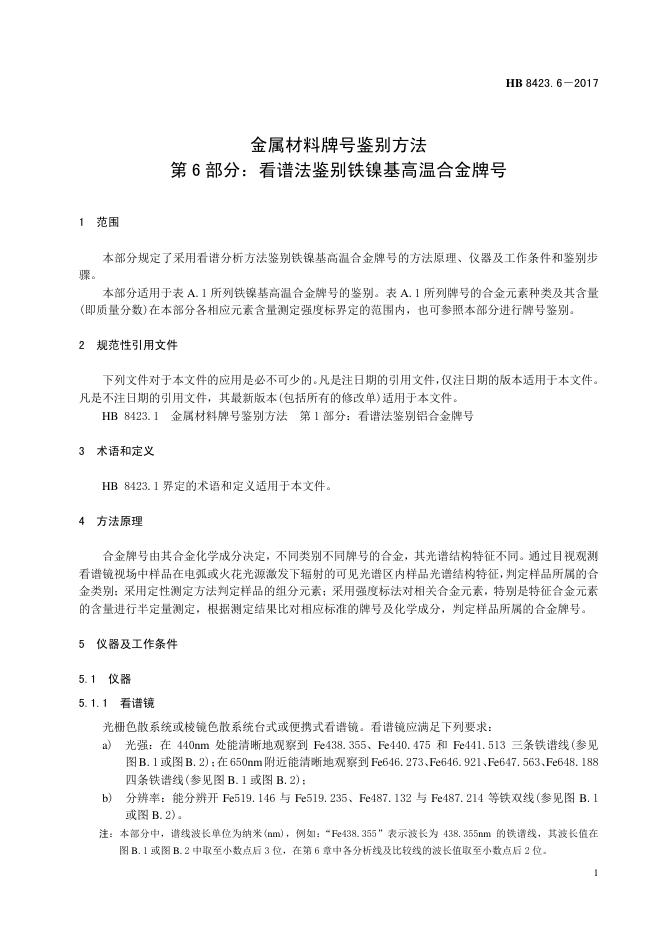 HB 8423.6-2017 金属材料牌号鉴别方法 第6部分:看谱法鉴别铁镍基高温 合金牌号