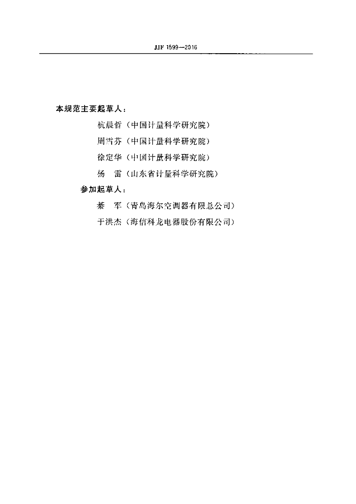 杭晨哲(中国计量科学研究院)、周雪芬(中国计量科学研究院)、徐定华(中国计量科学研究院)、杨雷(山东省计量科学研究院)、纂军(青岛海尔空调器有限总公司)、于洪杰(海信科龙电器股份有限公司)