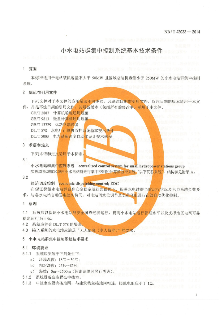 NB/T 42033-2014 小水电站群集中控制系统基本技术条件