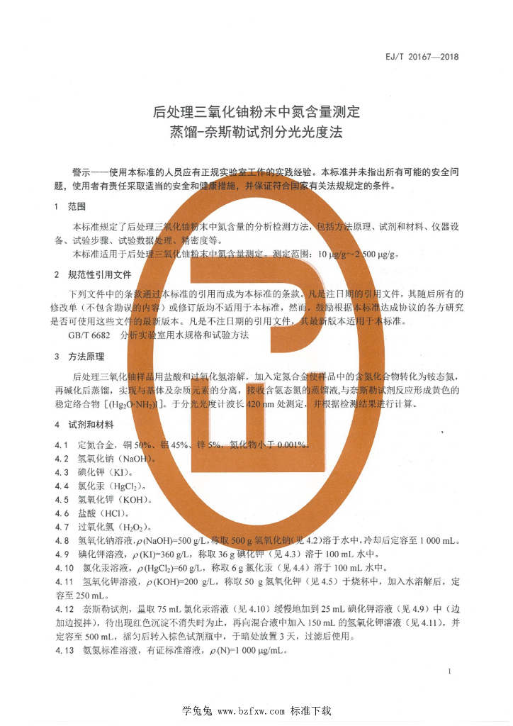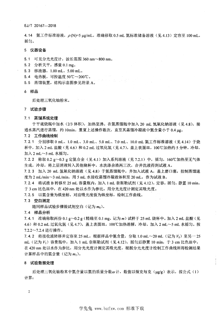 EJ/T 20167-2018 后处理三氧化铀粉末中氮含量测定 蒸馏-奈斯勒试剂分光光度法