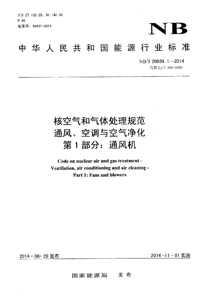 NB/T 20039.1-2014 核空气和气体处理规范通风、空调与空气净化 第1部分:通风机