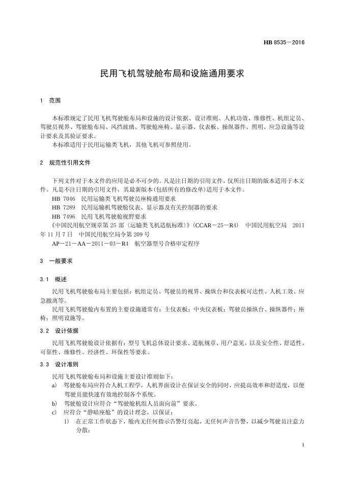 HB 8535-2016 民用飞机驾驶舱布局和设施通用要求