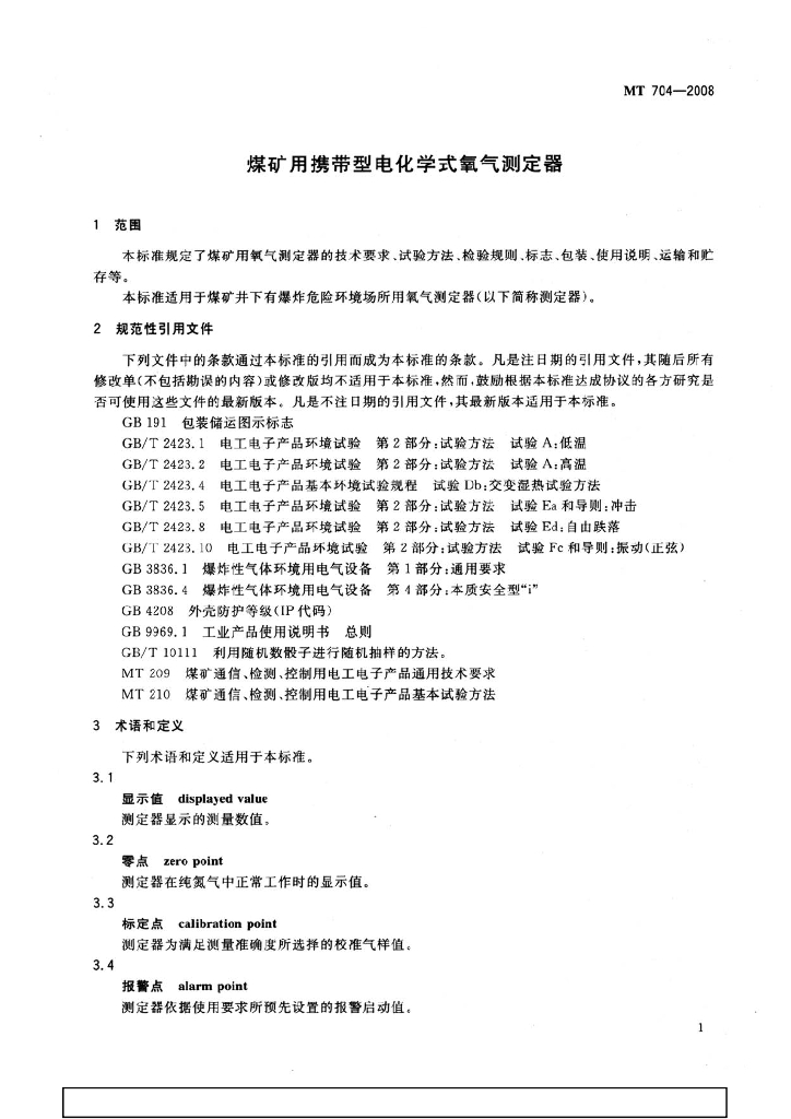 MT 704-2008 煤矿用携带型电化学式氧气测定器