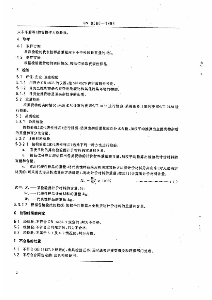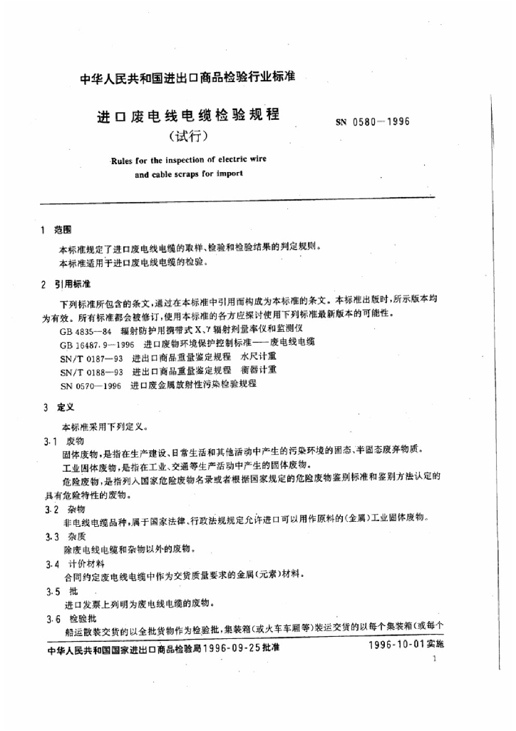 SN 0580-1996 进口废电线电缆检验规程