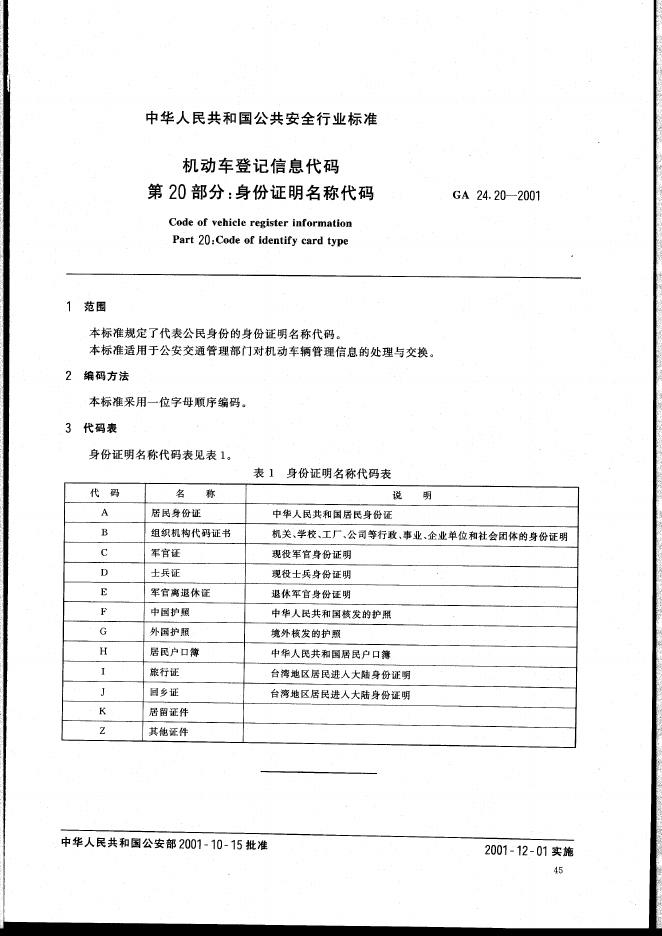 GA 24.20-2001 机动车登记信息代码 第20部分:身份证明名称代码