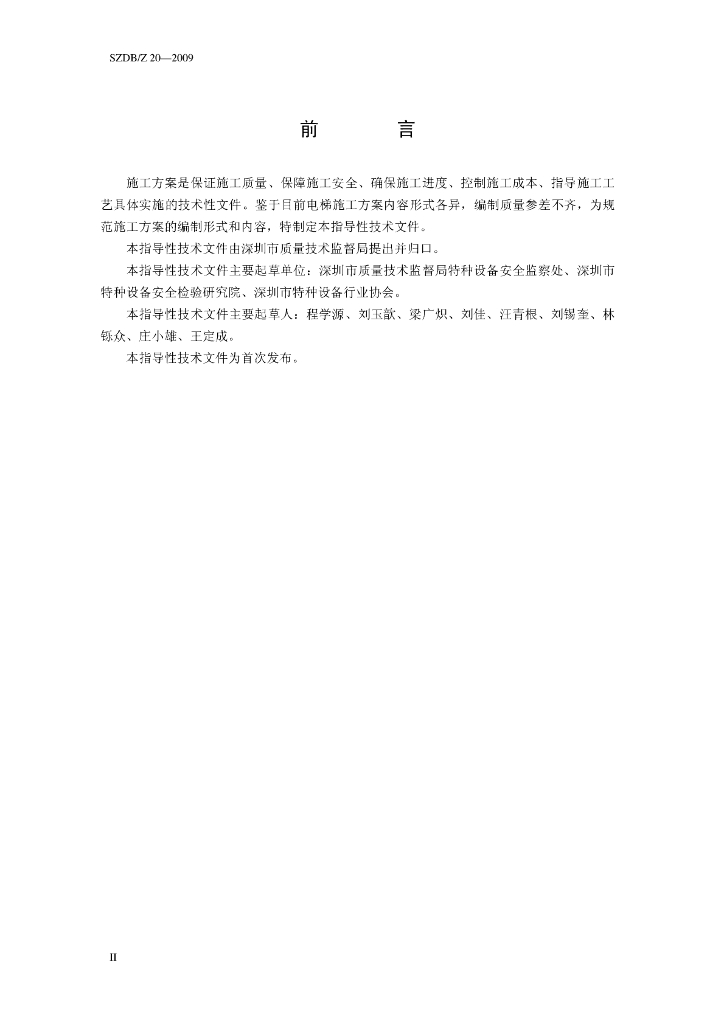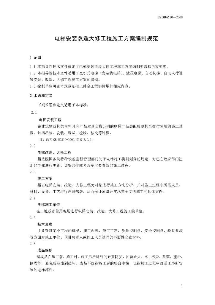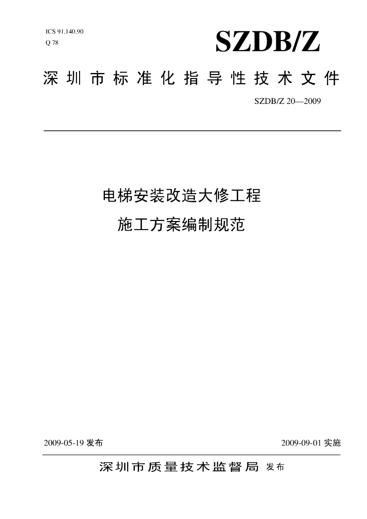 SZDB/Z 20-2009 电梯安装改造大修工程施工方案编制规范