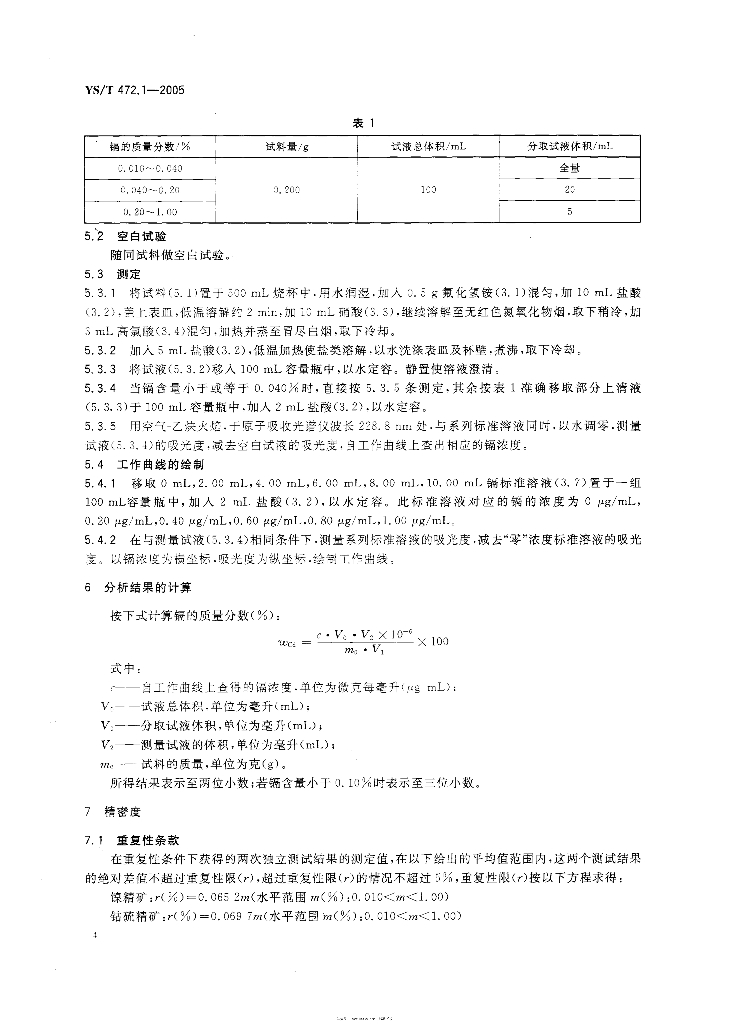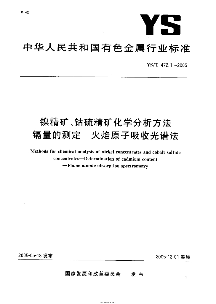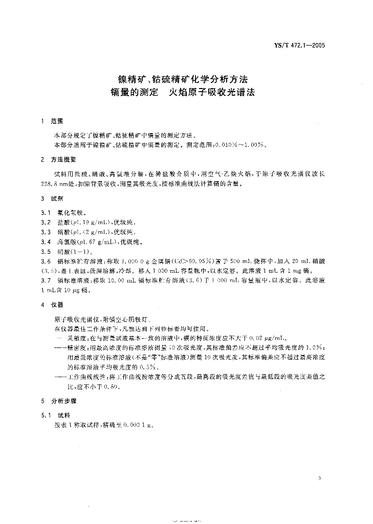 YS/T 472.1-2005 镍精矿、钴硫精矿化学分析方法 镉量的测定 火焰原子吸收光谱法