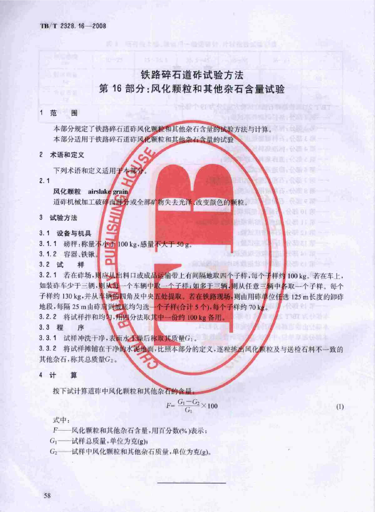 TB/T 2328.16-2008 铁路碎石道砟试验方法 第16部分:风化颗粒和其他杂石含量试验