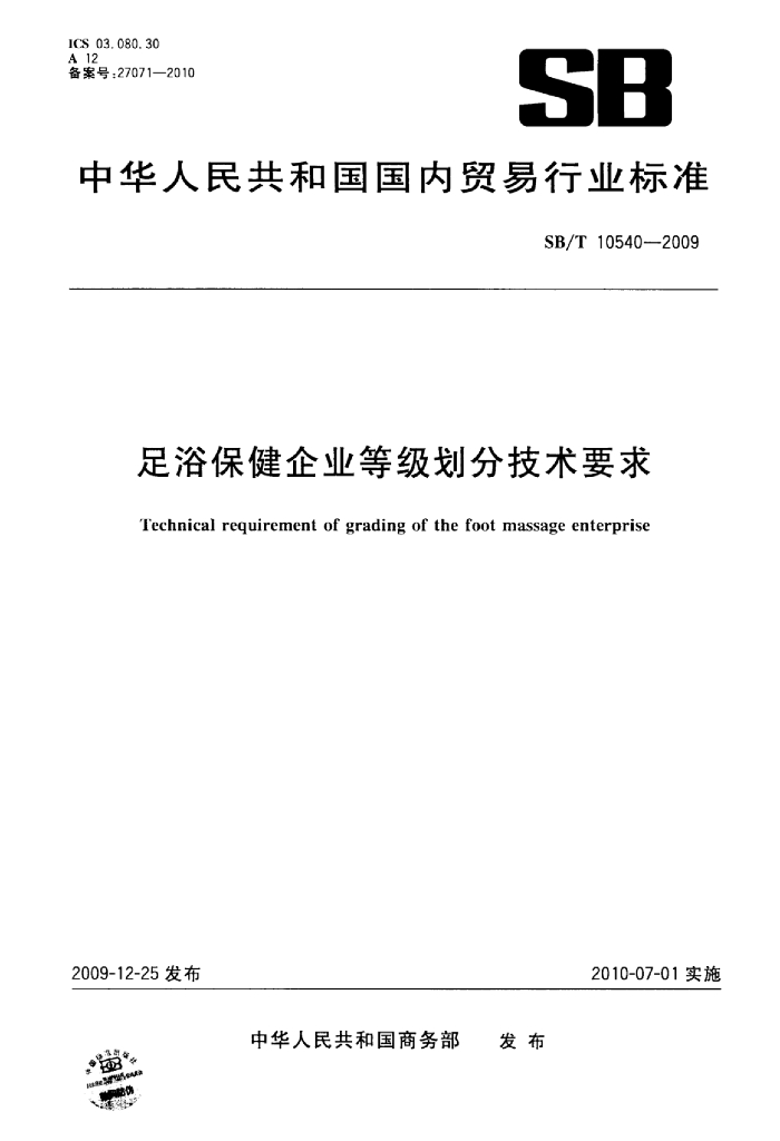 SB/T 10540-2009 足浴保健企业等级划分技术要求