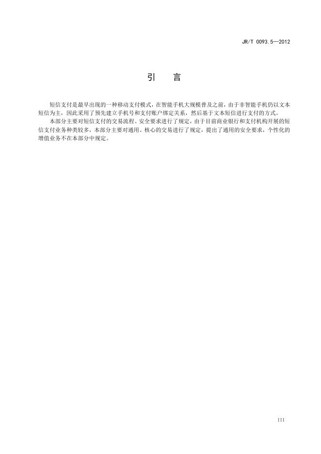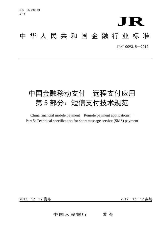 JR/T 0093.5-2012 中国金融移动支付 远程支付应用 第5部分:短信支付技术规范
