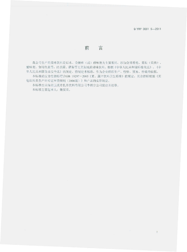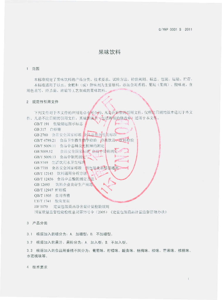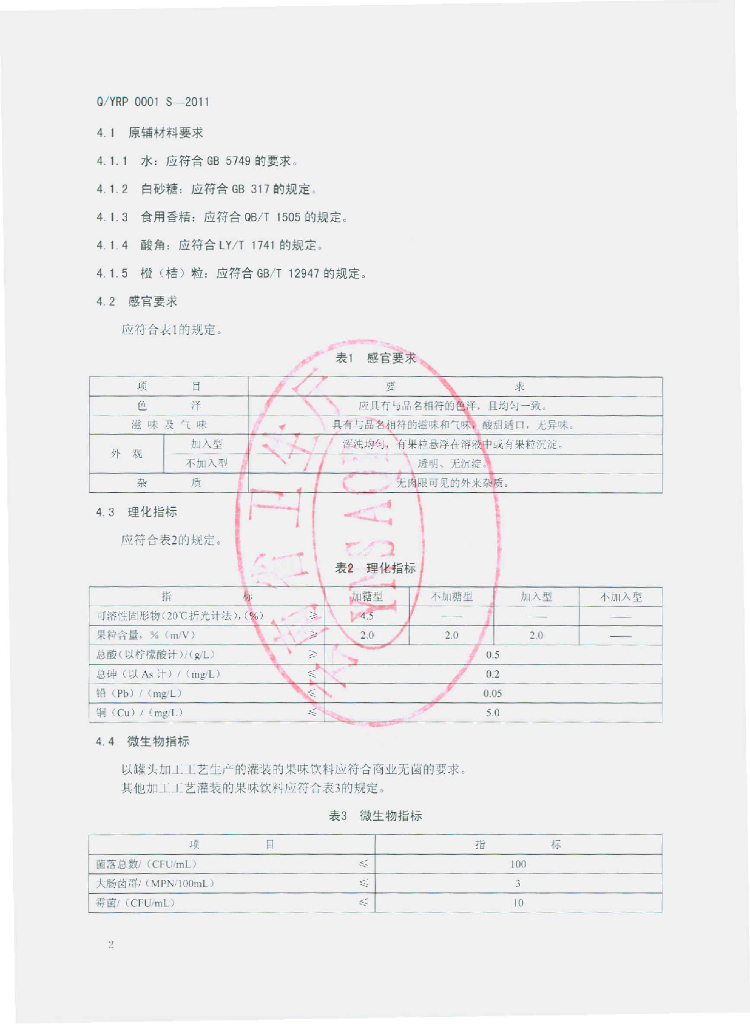 Q/YRP 0001S-2011 果味饮料