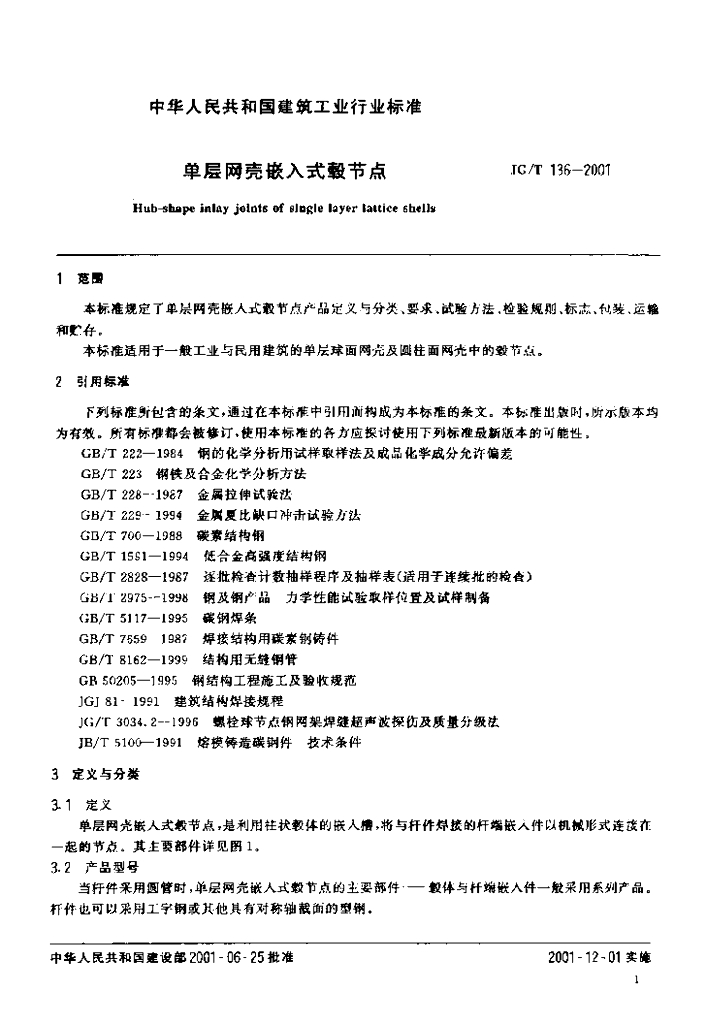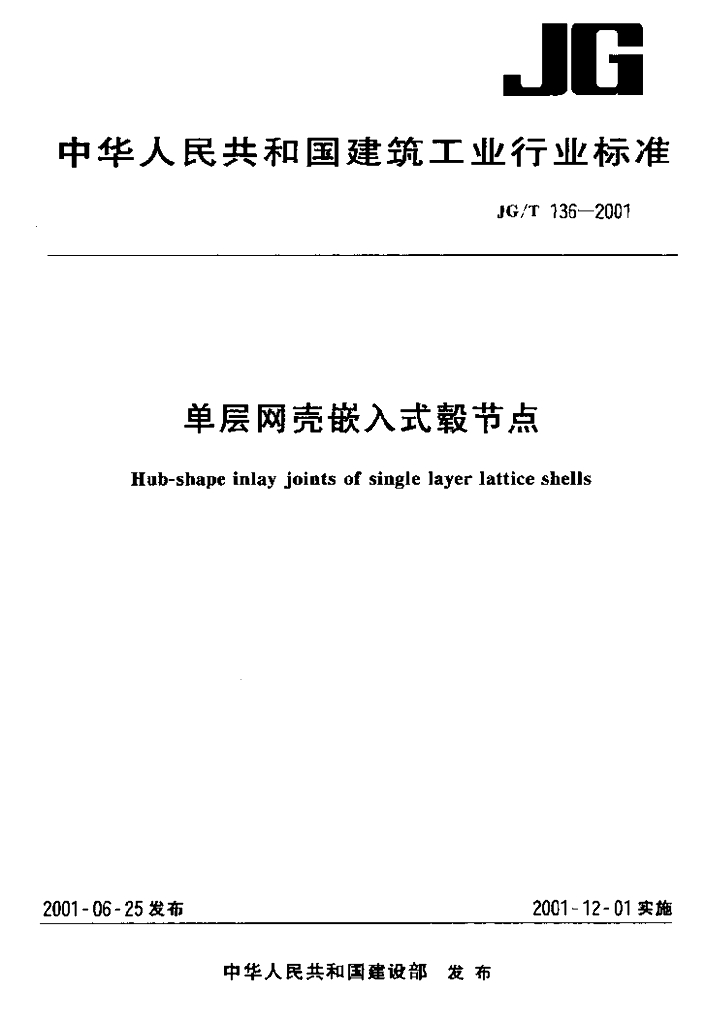 JG/T 136-2001 单层网壳嵌入式毂节点