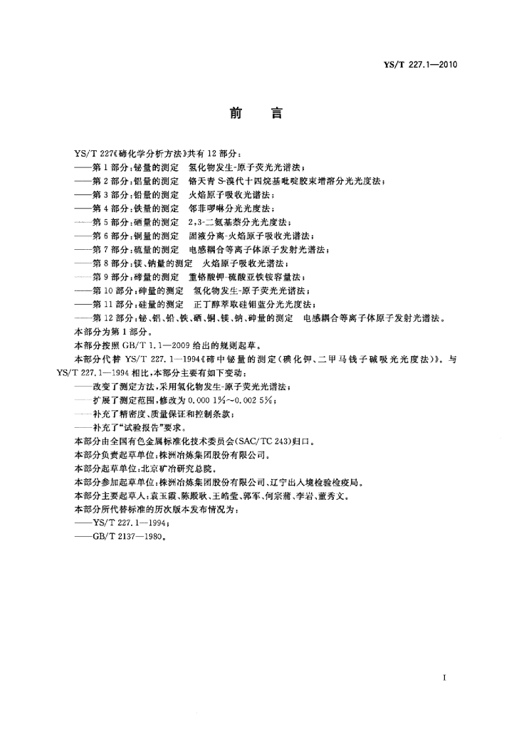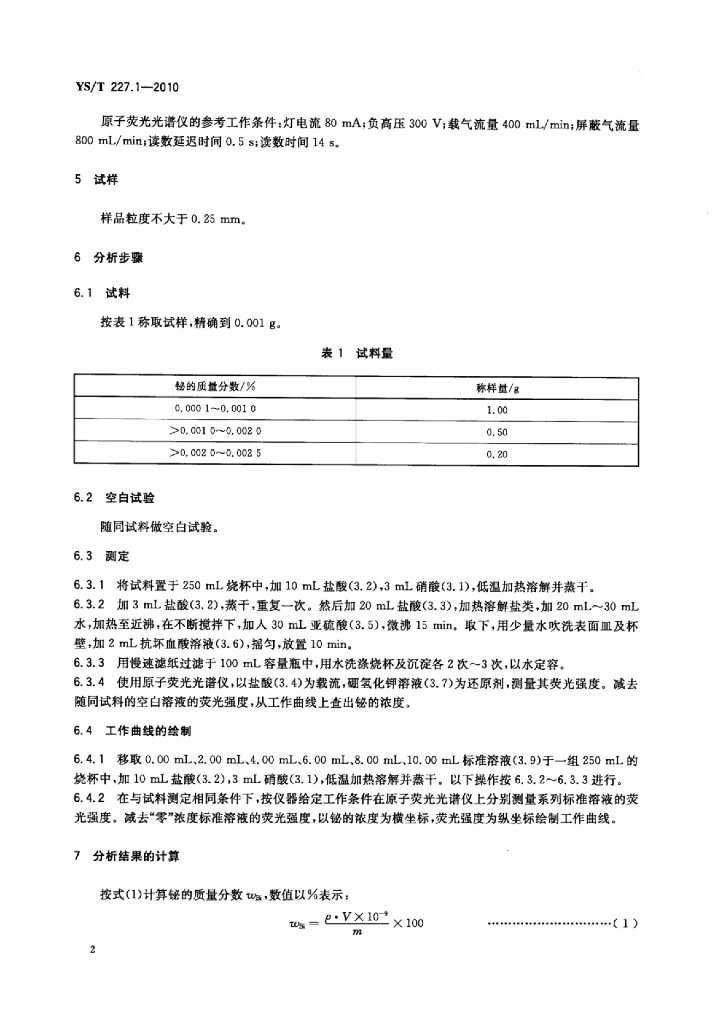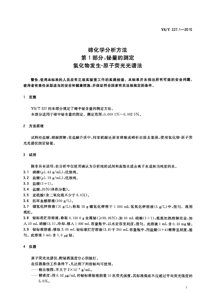 YS/T 227.1-2010 碲化学分析方法 第1部分:铋量的测定氢化物发生-原子荧光光谱法