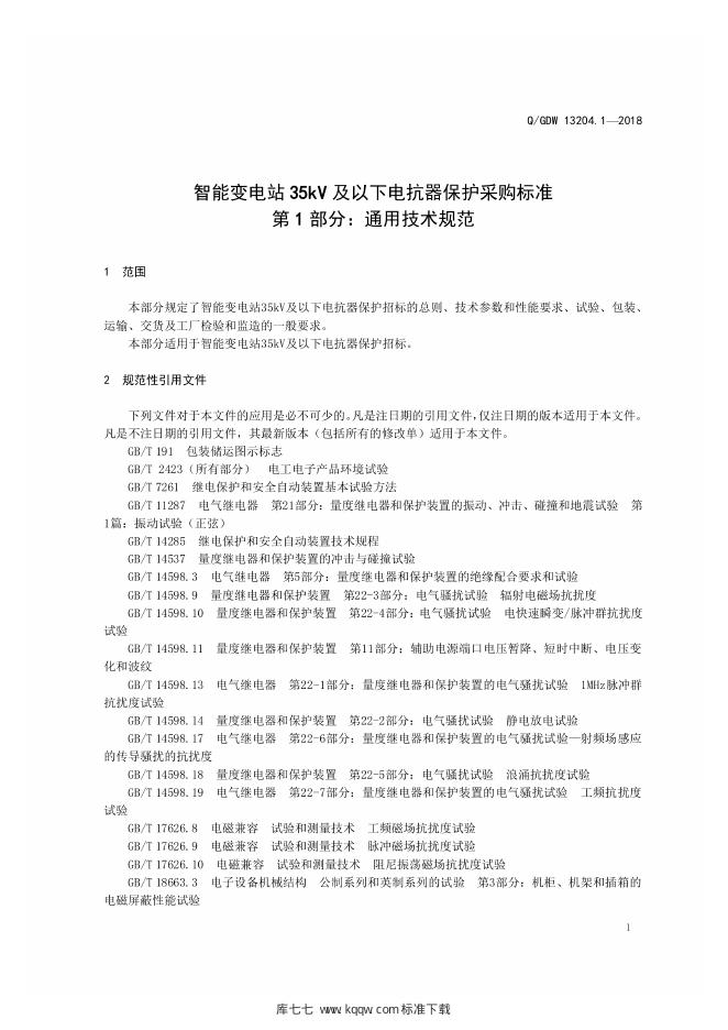 Q/GDW 13204.1-2018 智能变电站35kV及以下电抗器保护采购标准 第1部分:通用技术规范
