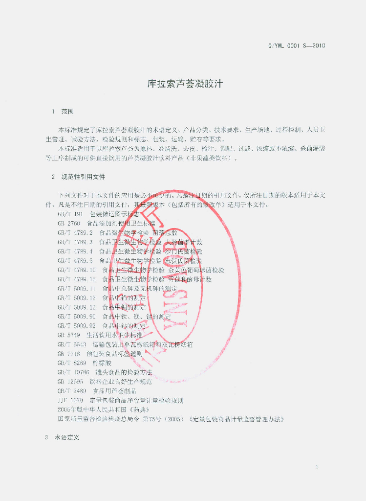 Q/YWL 0001S-2010 库拉索芦荟凝胶汁