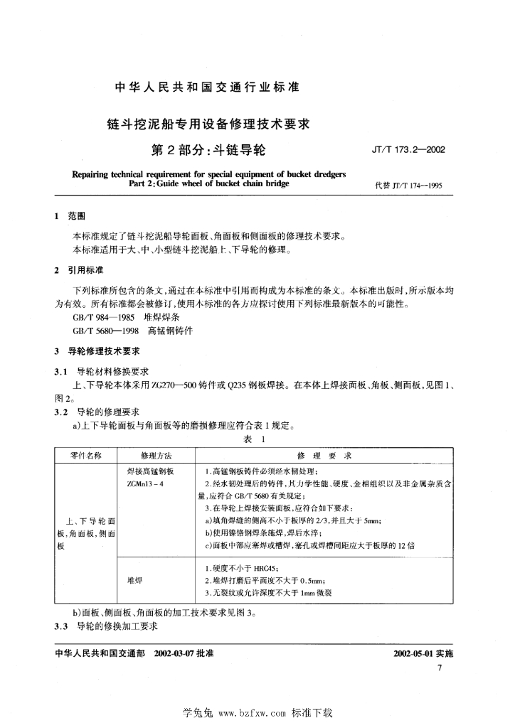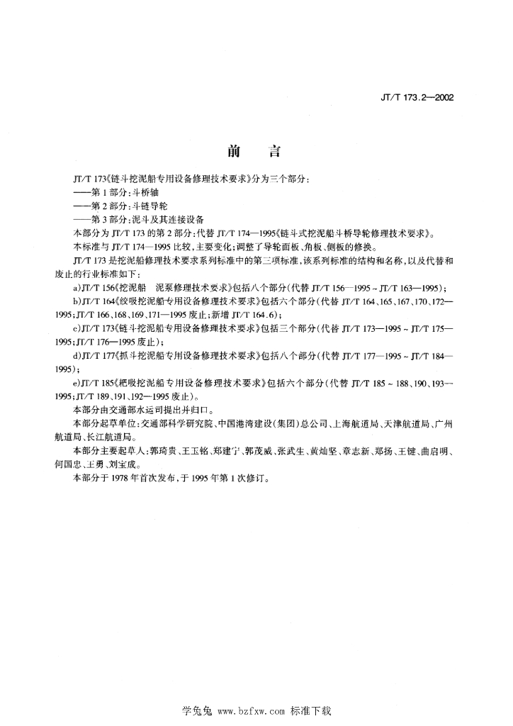JT/T 173.2-2002 链斗挖泥船专用设备修理技术要求 第2部分:斗链导轮