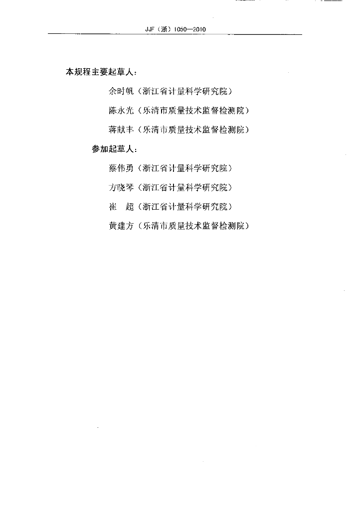 余时帆(浙江省计量科学研究院)、陈永光(乐清市质量技术监督检测院)、蒋献丰(乐清市质量技术监督检测院)、蔡伟勇(浙江省计量科学研究院)、方晓琴(浙江省计量科学研究院)、崔超(浙江省计量科学研究院)、黄建方(乐清市质量技术监督检测院)