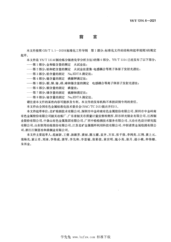 北矿检测技术有限公司、深圳市中金岭南有色金属股份有限公司、深圳市中金岭南有色金属股份有限公司韶关冶炼厂、广东省韶关市质量计量监督检测所、阳谷祥光铜业有限公司、江西铜业股份有限公司、中条山有色金属集团有限公司、广西中检检测技术服务有限公司、大冶有色设计研究院有限公司、山东恒邦冶炼股份有限公司、江苏北矿金属循环利用科技有限公司、中恒诺贵金属检测有限公司、浙江江铜富治和鼎铜业有限公司