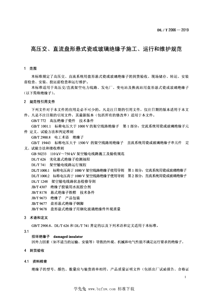 DL/T 2066-2019 高压交、直流盘形悬式瓷或玻璃绝缘子施工、运行和维护规范